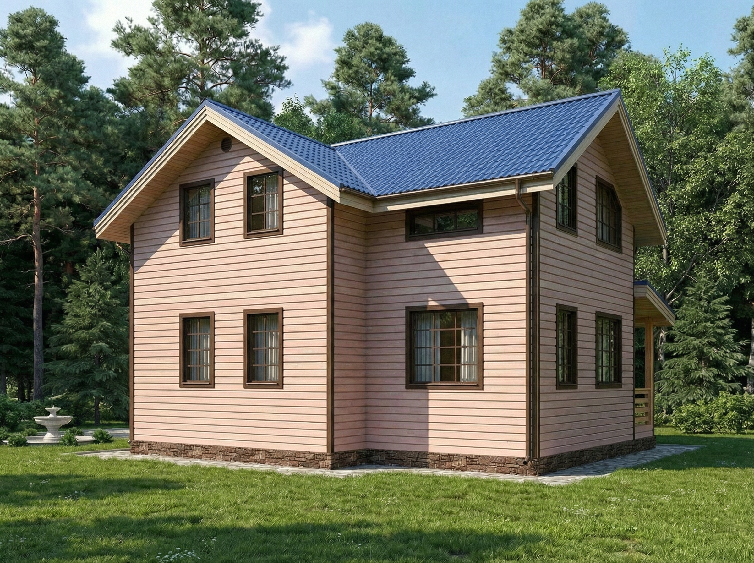 Классический каркасный дом 7,5×9,5 м комфортно сочетает просторную планировку с уютной внешней архитектурой. Большая площадь помещений — 118 м² — позволяет удобно организовать семейное пространство на двух этажах. Кровля с чистым рисунком и выразительный фасад с отделкой под дерево создают элегантный внешний вид, гармонирующий с природным ландшафтом.